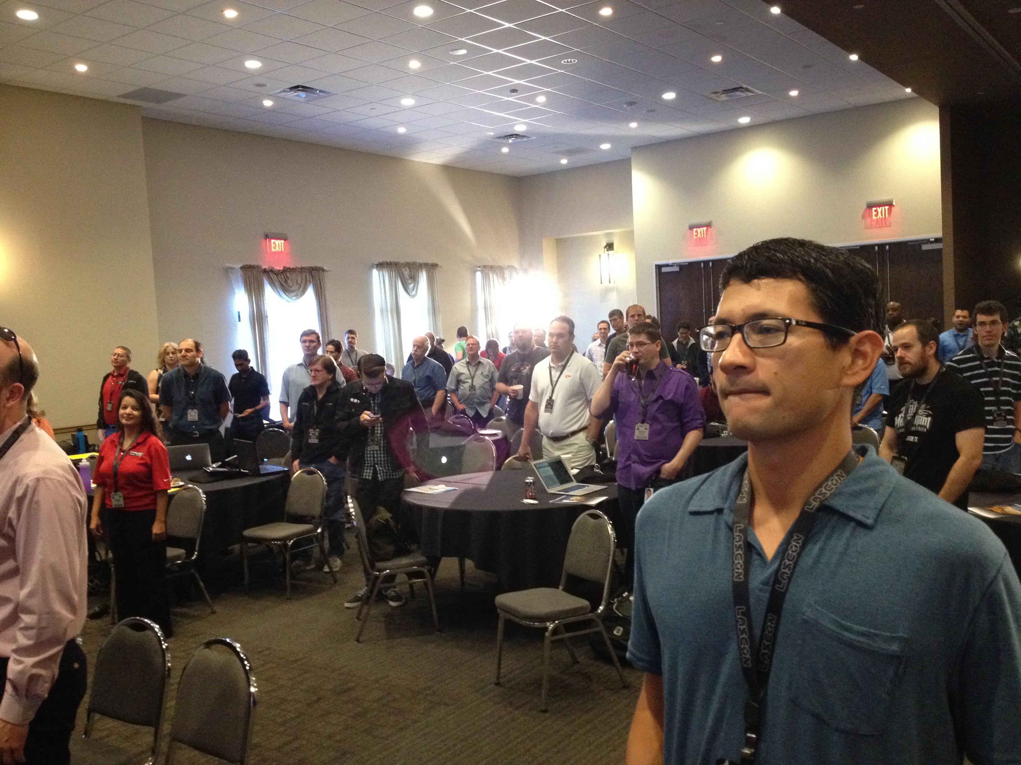 IMG_1482Then everyone stood and raised their right hand to say the “LASCON pledge,” which consists of “I will not hack the Wi-fi,” “I will not social engineer other attendees and the nice Norris Conference Center staff who are hosting us,” and similar.