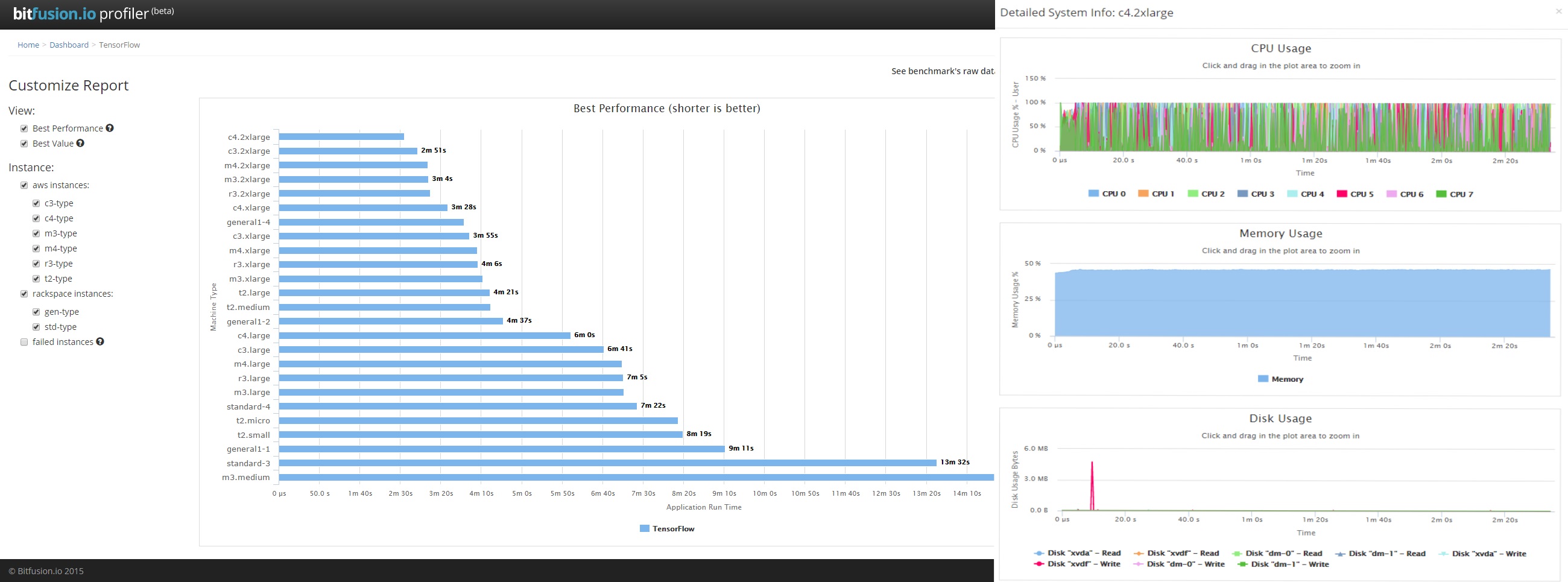For day to day use, all the above is triggered from our Jenkins build servers. However, for those interested in taking a lightweight version of our profiling architecture for a spin, we put a web front-end on this flow which can be found at http://profiler.bitfusionlabs.com – here you can build any type of Docker based application benchmark directly from a browser exposed terminal, and can get quick performance results from various instance types across multiple cloud providers. Feel free to share the benchmarks with your friends and colleagues, or make them public so that others can benefit from them as well.