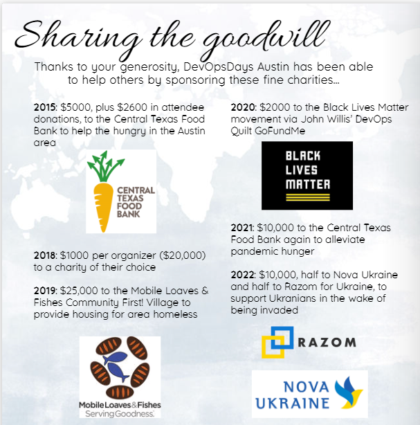 We’re one of the great grand-daddy DevOps events. We have years of experience, ample funding, and a big community. Smaller DoDs, especially ones getting off the ground, often need to hew close to the “standard format” for a safe launch and to pay their bills. We can afford to experiment, so I strongly urge the team every year to try different things. It’s OK if we appeal to different sets of the community each year. It’s OK to not do something again (even if it went well) and it’s OK to try new things as stretch goals. I kinda like putting how we run our event where our DevOps mouth is, so to speak.